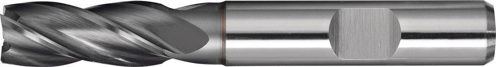 HSS-Co8 · DIN 844 · Typ N · Vierschneider · kurz · Zentrumschnitt · Zylinderschaft mit Mitnahmefläche · rechtsschneidend · zum Fräsen von Werkstoffen mit geringer und mittlerer Festigkeit bis ca. 800 N/mm² mit unbeschichtetem Werkzeug und 1000 N/mm² mit beschichtetem Werkzeug