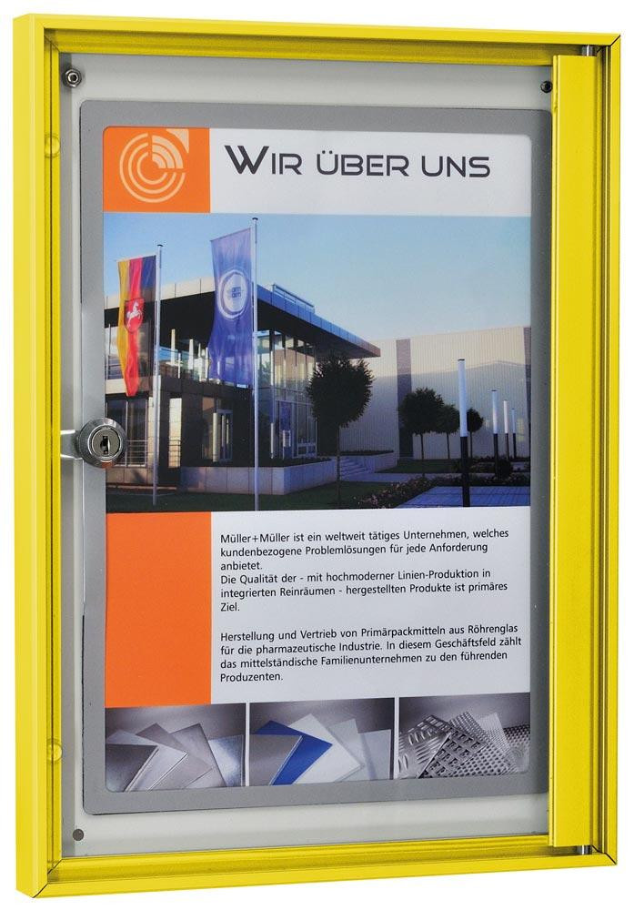 Schaukasten, BxTxH 280x27x380 mm, 1xDIN A4, Aluprofile gelb, ESG-Glas, Rückwand weiß, magneth.