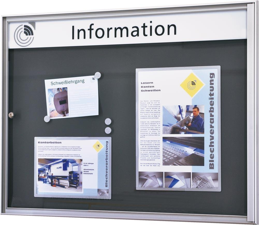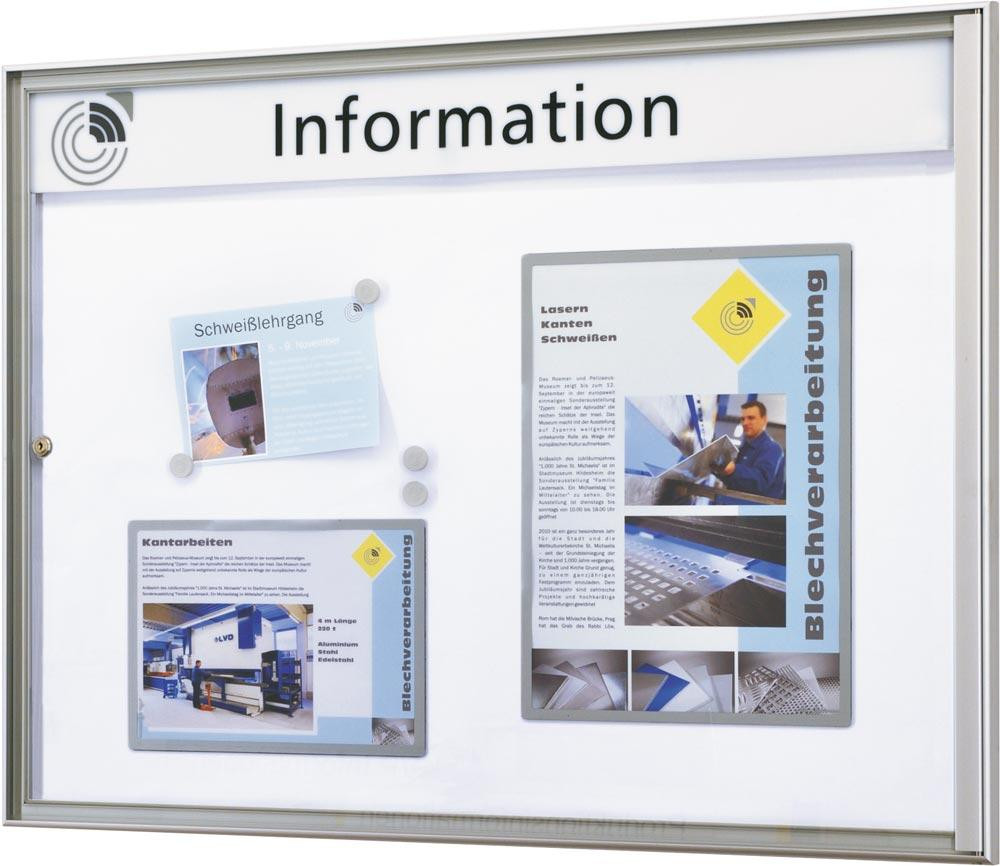 · Stabiler Schaukasten aus Aluminium-Profilen, silber eloxiert · Bautiefe 27 mm · Rahmenlose Einscheiben-Sicherheits-Ganzglasscheibe (ESG) · Eine umlaufende Dichtschnur schützt vor Staub · Öffnung mit Drehflügel seitlich nach rechts · Abschließbar · Entsprechen den Brandschutzbestimmungen B1 · Inkl. 10 Magnete grau und 1 Einstecktasche DIN A4 · Lieferung ohne Schriftleiste
