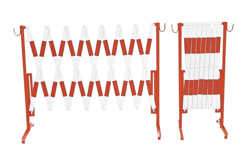 Scherensperrgitter, weiß mit roten Reflexstreifen, Ständer aus Stahlrohr, Stäbe aus Flachstahl 25/4 mm, Höhe 1000 mm, ausziehbar bis 3600 mm