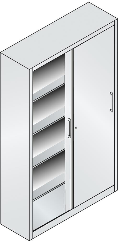 ∙ Verschweißte Stahlblechkonstruktion mit hochwertiger Einbrennlackierung ∙ Schiebetüren mit Spezialkugellagerrollen in stabiler Schienenführung ∙ Aufsatzschränke gleichschließend mit Grundschrank auf Wunsch lieferbar ∙ Verchromter Bügelgriff, Dreh-Druckzylinderschloss inkl. 2 Schlüsseln ∙ In Korpusfarbe lackierte Fachböden im Raster von 15 mm höhenverstellbar · Traglast pro Fachboden 70 kg (bei gleichmäßig verteilter Last)
