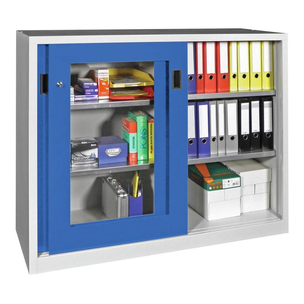 Schiebetürenschrank, Sichtfenstertüren, 4 verzinkte Böden, mit Trennwand, BxTxH 1500x600x1200 mm, RAL 7035/5010