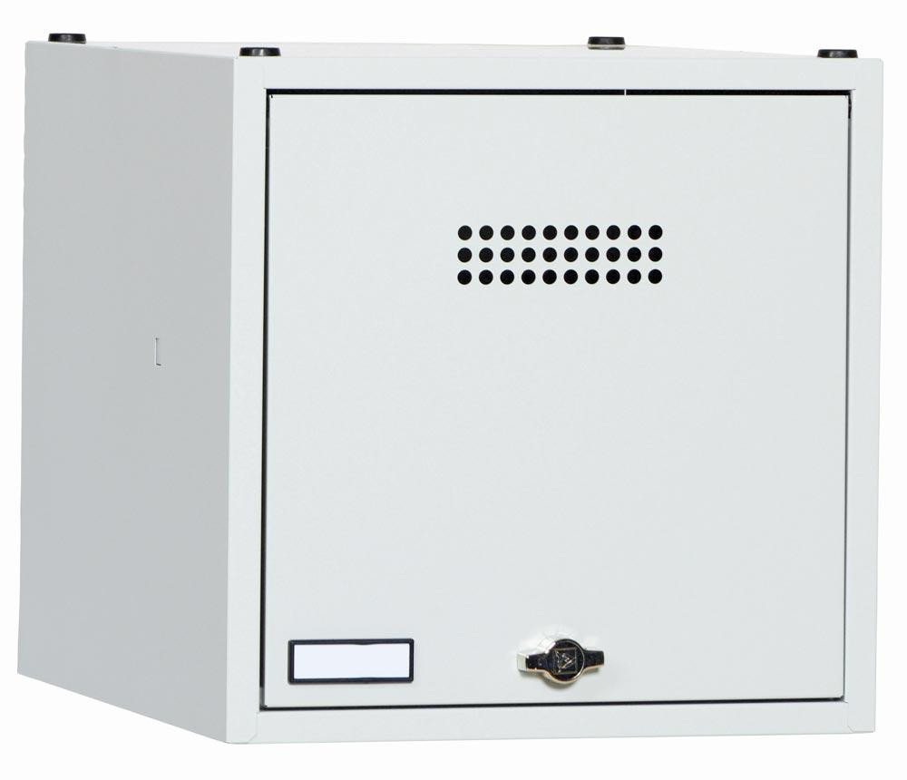 Schließfachwürfel, BxTxH 400x500x400 mm, Tür glatt, Lochrosetten und Etikettenrahmen, Fachboden, Drehriegel, RAL 7035