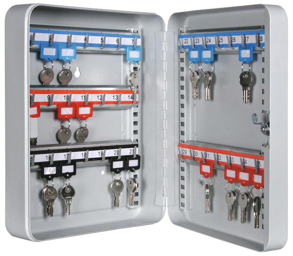 Schlüsselkassetten, Stahlblech, Raster-Hakenleisten, 60 Haken, Zylinderschloss, BxTxH 240x75x300 mm