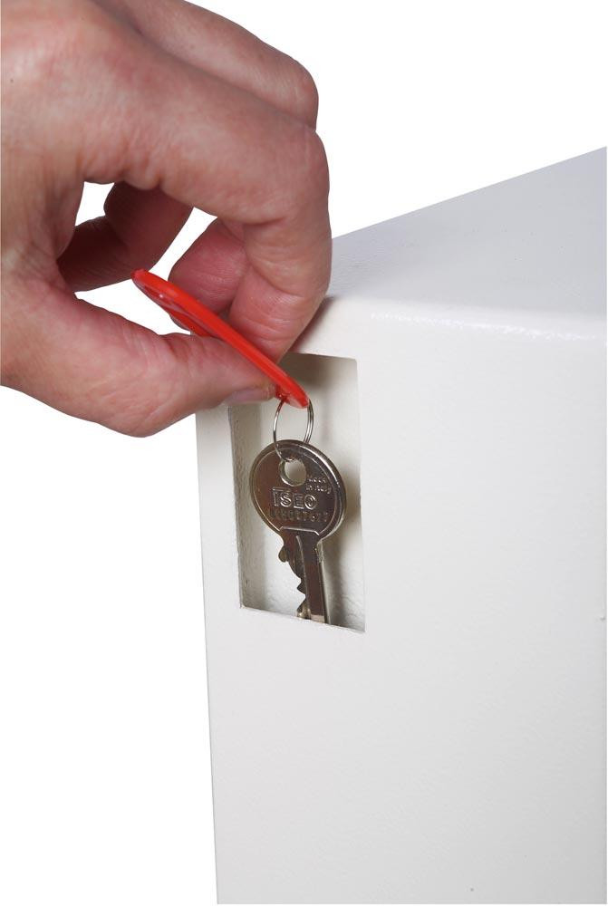 · Einfacher Tresor für den Einsatz in der Werkstatt oder im Büro · Über den seitlichen Einwurfschlitz können Schlüssel eingeworfen werden, ohne den Tresor zu öffnen · Korpus und und Tür einwandig · Benutzerfreundliches, elektronisches Tastenschloss mit manipulationsgesicherter Magnetverriegelung · Mit 2 Revisionsschlüsseln für den Fall, dass der Code vergessen wurde · Vorbereitet für die Wandverankerung · Inkl. Verankerungsmaterial, Schlüsselringen und farbigen Schlüsselanhängern · Lackierung RAL 9003 signalweiß