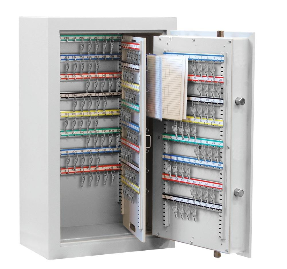 ∙ Korpus einwandig 3 mm stark, Tür doppelwandig 57 mm stark, Türblatt 6 mm stark ∙ Dreiseitige Verriegelung über Doppelbart-Sicherheitsschloss inklusive zwei Schlüsseln ∙ Vier Bohrungen in der Rückwand zur Befestigung an der Wand ∙ Hakenleisten im Raster verstellbar, verschiedenfarbig und fortlaufend nummeriert ∙ Lackierung in RAL 7035 lichtgrau