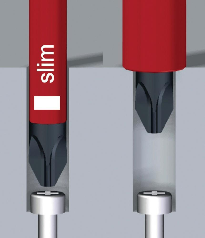 Durch die im vorderen Bereich vollständig in die Klinge integrierte Schutzisolation können auch tiefliegende Schrauben gut erreicht werden.