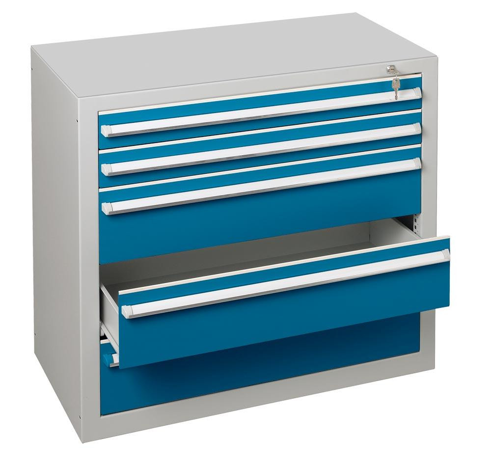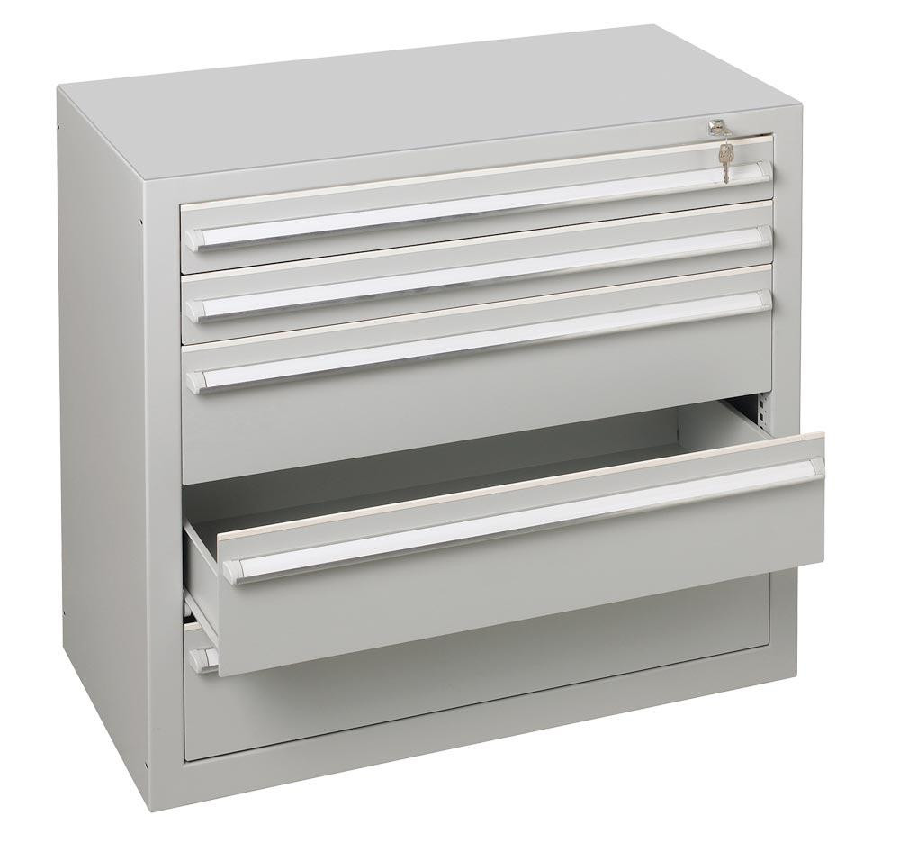 ∙ Stabil verschweißte Stahlkonstruktion ∙ Standardmäßig mit Abdeckboden in Korpusfarbe · Mit Rück- und Seitenwänden ∙ Mit Schließanlage und Kippsicherung ∙ Freistehende Aufstellung möglich ∙ Schubladen mit kugelgelagerten Laufschienen und Endanschlag, ausziehbar bis 90 % ∙ Griffleiste mit Beschriftungsfeld und Abdeckfolie · Schubladengrundfläche B x T 856 x 425 mm ∙ Gesamtbreite 1000 mm ∙ Gesamttiefe 500 mm ∙ Belastbarkeit 70 kg (bei gleichmäßig verteilter Last)