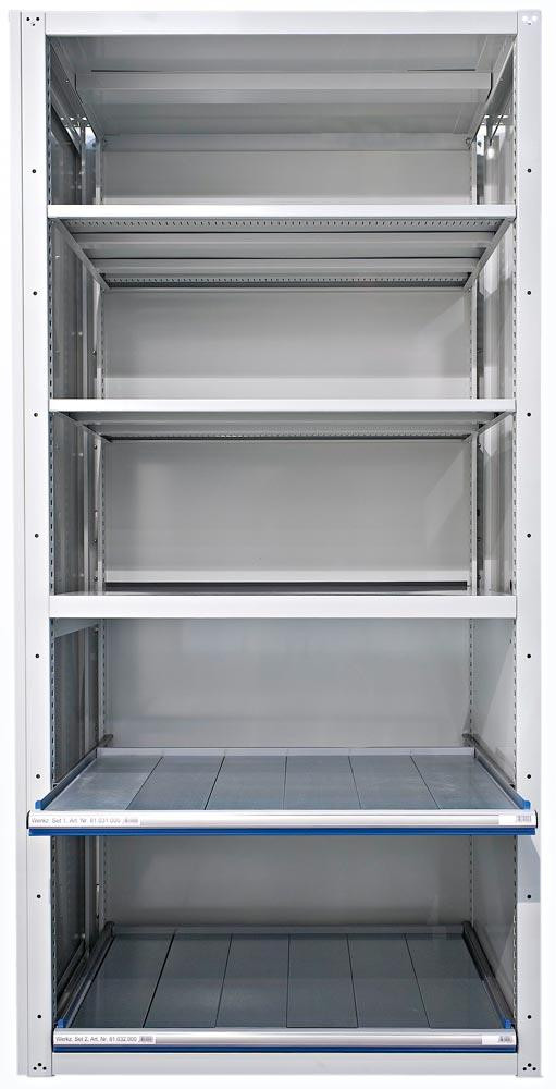 Schubladenregal, Grundfeld, 3 Universal-, 2 Verstell- und 2 Auszugböden, BxTxH 1117x706x2200 mm, RAL 7035/5012