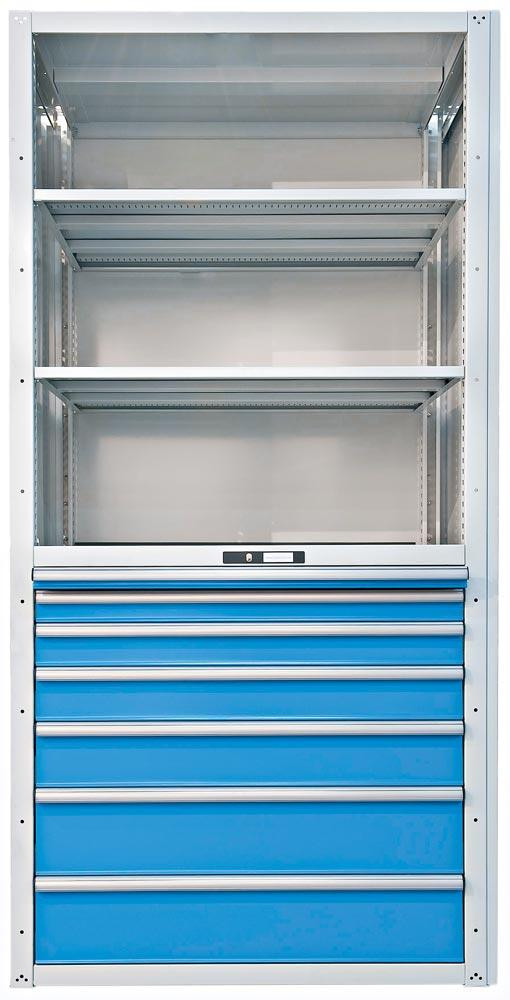 Schubladenregal, Grundfeld, 3 Universal-, 2 Verstellböden, 7 Schubladen, BxTxH 1117x706x2200 mm, RAL 7035/5012