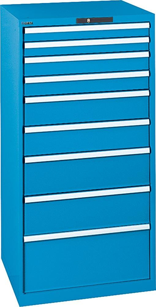 Schubladenschrank, Traglast/Schubl.: 200 kg, 9 Schubladen 2x75,2x100,2x150,2x200,300 mm, Zylinderschloss, BxTxH 717x725x1450 mm, RAL 5012