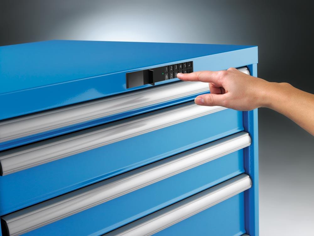Schubladenschrank-Gehäuse mit elektr. Zahlenschloss, BxTxH 1023x725x1450 mm, RAL 7035