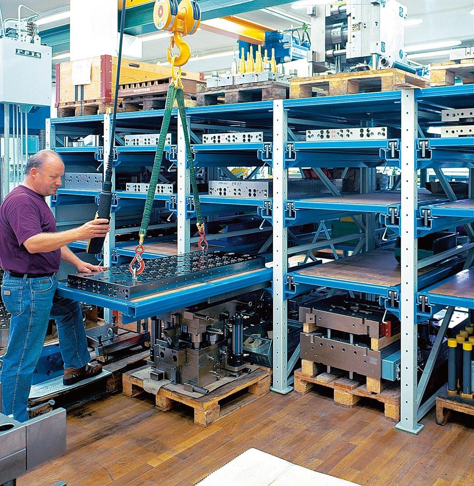 ∙ Hohe Stabilität durch verschweißte Stahlblechkonstruktion ∙ Für eine ideale Lagerung von schweren Gütern (u. a. Spritzgussformen, Stanzwerkzeuge, Motoren) ∙ Beschickung mit Kran und Gabelstapler möglich