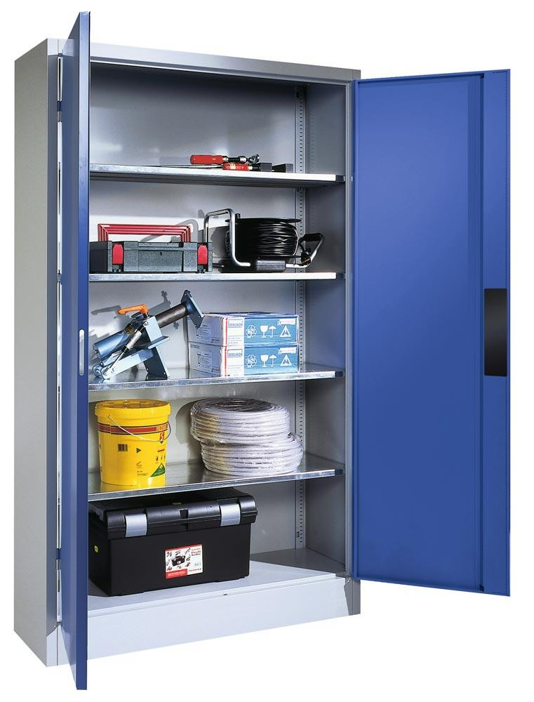 · Besonders stabile, verwindungssteife Stahlblechkonstruktion · Hochwertige Einbrennbeschichtung · Schränke mit gemeinsam verschließbaren Flügeltüren mit Verstärkungsprofilen · Türöffnungswinkel 180° · 3-riegeliges-Griffschloss mit patentiertem Mechanismus · Schranklast bis 700 kg · Ausgestattet mit 4 Fachböden im Raster von 15 mm verstellbar, Traglast je Fachboden 110 kg bei gleichmäßig verteilter Last