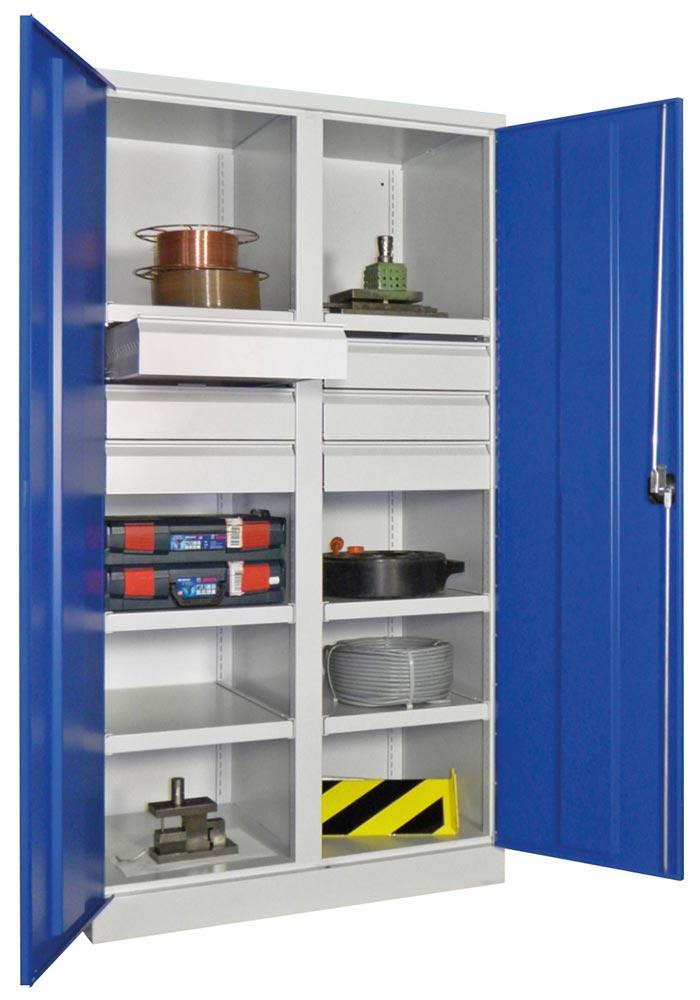 ∙ Besonders stabile, verwindungssteife Stahlblechkonstruktion ∙ Oberfläche pulverbeschichtet ∙ Schränke mit gemeinsam verschließbaren Flügeltüren mit Verstärkungstaschen ∙ Die Türen sind über einen dreiriegeligen Drehgriff mit integriertem Zylinderschloss inkl. 2 Schlüsseln verschließbar ∙ Türöffnung 180 ° ∙ Belastbarkeit je Boden 120 kg bzw. 200 kg, je Schublade 60 kg bei gleichmäßig verteilter Last ∙ Gehäuse-Belastbarkeit 1300 kg ∙ Einrichtungselemente im Raster von