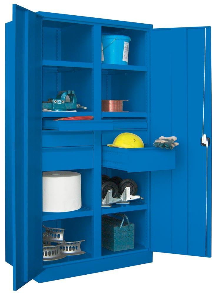 ∙ Besonders stabile, verwindungssteife Stahlblechkonstruktion ∙ Oberfläche pulverbeschichtet ∙ Schränke mit gemeinsam verschließbaren Flügeltüren mit Verstärkungstaschen ∙ Die Türen sind über einen dreiriegeligen Drehgriff mit integriertem Zylinderschloss inkl. 2 Schlüsseln verschließbar ∙ Türöffnung 180 ° ∙ Belastbarkeit je Boden 120 kg bzw. 200 kg, je Schublade 60 kg bei gleichmäßig verteilter Last ∙ Gehäuse-Belastbarkeit 1300 kg ∙ Einrichtungselemente im Raster von