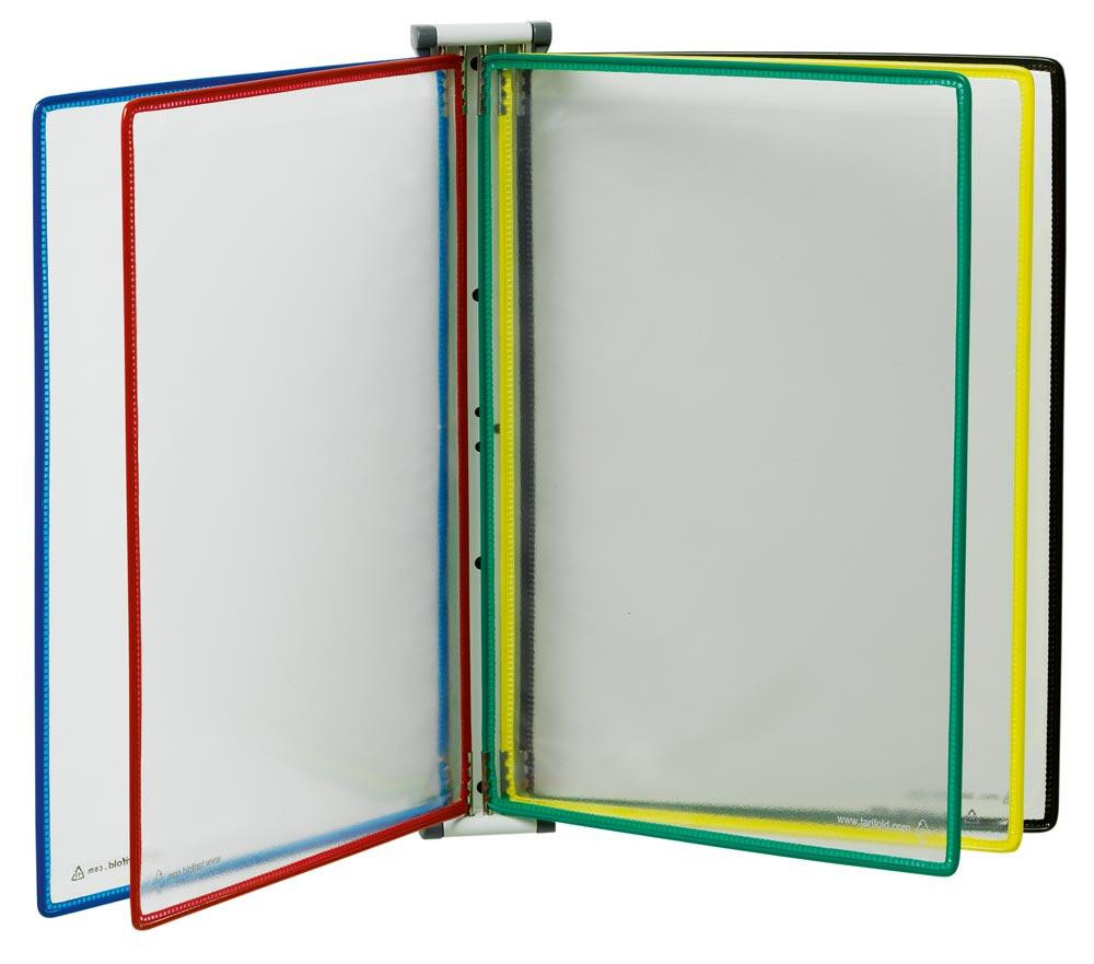 · Magnetischer Rücken · Mit integriertem Neigewinkel für optimale Lesbarkeit · Aus lackiertem Stahlblech · Farbe lichtgrau · Inkl. Sichttafeln DIN A4, farbig sortiert (blau, rot, gelb, grün, schwarz)
