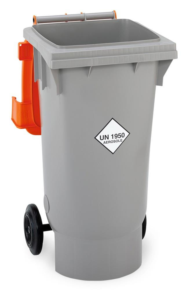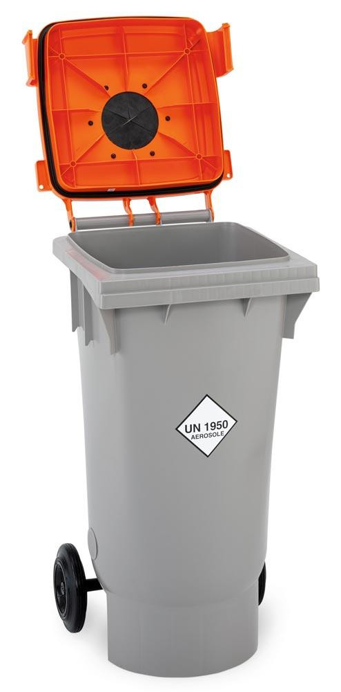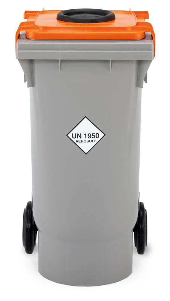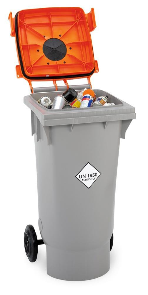 · Fahrbarer Sammelbehälter für leere und teilentleerte Spraydosen · Geprüfte Sicherheit durch UN-Zulassung 1H2W/X150/S...· Zertifiziert für UN 1950 (Abfalldruckgaspackungen) · Eingearbeitete Öffnung zum Einwurf der Spraydosen auch bei geschlossenem Deckel · Deckel mit Gummidichtung und stabilem Schnappverschluss · Zwei integrierte Entlüftungsöffnungen im Korpus für Luftzirkulation · Zusätzliche Sicherheit durch Herstellung mit antistatischem Kunststoff, dadurch besonders geeignet zur Aufstellung im Gebäude · Große Räder und vergütete Stahlachse zum besseren Bewegen auch in gefülltem Zustand · Maximalgewicht von bis zu 150 kg · Lieferung inklusive Vliestuch (zum Aufsaugen freiwerdender Flüssigkeiten) sowie Gefahrgut-Aufkleber "UN1950" ∙ Zum Transport nach ADR einschlägige Verpackungsanweisungen beachten · Korpus in grau, Deckel in orange