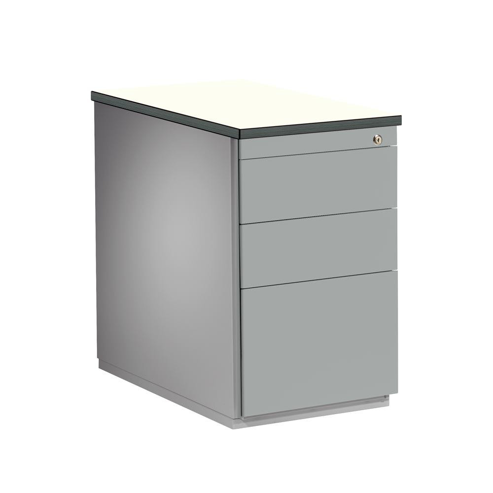· Stabiles, verschweißtes Gehäuse aus wiederverwertbarem Stahl · Hochwertige Einbrennlackierung · Container sind gegen Kippen nach vorne gesichert · Schubladen serienmäßig mit soft-close-Dämpfungssystem · Unauffällige seitliche, leicht bedienbare Griffrinne · Sperre gegen Doppelauszug · Verschließbar über Dreh-Wechselkern-Zylinderschloss mit Klappschlüssel und Zweitschlüssel · Utensilienschub inkl. Fächerschale in soft-grip-Ausführung mit Weichkunststoff-Beschichtung · Abdeckplatte melaminharzbeschichtet mit ABS-Umleimer, 19 mm stark · Sockel 100 mm hoch · Traglast je Schublade 18 kg