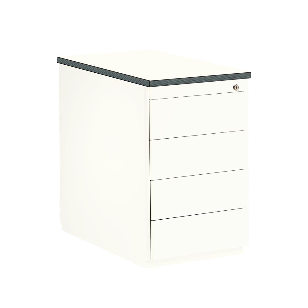 · Stabiles, verschweißtes Gehäuse aus wiederverwertbarem Stahl · Hochwertige Einbrennlackierung · Container sind gegen Kippen nach vorne gesichert · Schubladen serienmäßig mit soft-close-Dämpfungssystem · Unauffällige seitliche, leicht bedienbare Griffrinne · Sperre gegen Doppelauszug · Verschließbar über Dreh-Wechselkern-Zylinderschloss mit Klappschlüssel und Zweitschlüssel · Utensilienschub inkl. Fächerschale in soft-grip-Ausführung mit Weichkunststoff-Beschichtung · Abdeckplatte melaminharzbeschichtet mit ABS-Umleimer, 19 mm stark · Sockel 100 mm hoch · Traglast je Schublade 18 kg