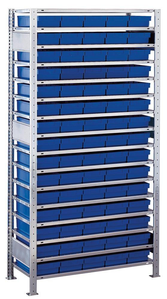 Steckegal, verzinkt, mit Kästen, Grundfeld, BxTxH 1000x300x2000 mm, 16 Böden, 75 blaue Kästen, BxTxH 186x300x83 mm