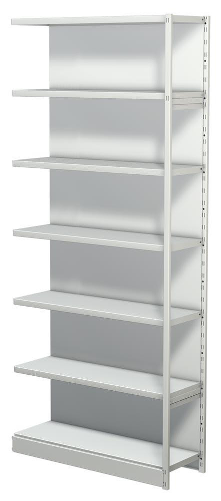 Steckregal mit Rückwand, Anbaufeld, 7 Fachböden, 6 OH, BxTxH 960x300x2250 mm, lichtgrau