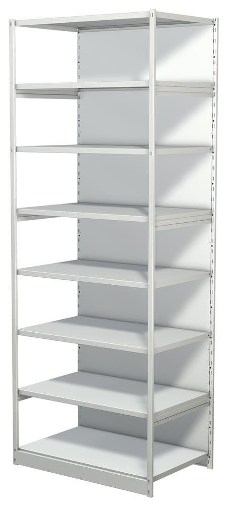 ∙ Optimale Raumausnutzung ∙ Fachböden 30 mm stark, im Raster von 59 mm höhenverstellbar ∙ Regalpfosten aus Kastenprofilen mit glatten Fronten ∙ Serienmäßig mit bodenbündiger Sockelblende ∙ Mit zusätzlichen Fachböden, Fachteilern, Seiten- und Trennstegen und Pendelhefterschienen individuell auszustatten ∙ Türen-Anbausätze, Seitenblenden und Zwischenwände ermöglichen die problemlose Integration von Schrankelementen ∙ Hochwertige Pulverbeschichtung in RAL 7035 lichtgrau