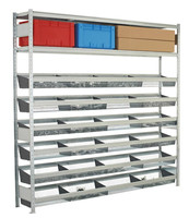 Kanban-Regal, Anbaufeld, einseitig, BxTxH 1000x600x2000 mm, 7 Schrägböden mit je 5 Trennführungen, 2 Seitenführungen, 1 Abdeckboden, verzinkt