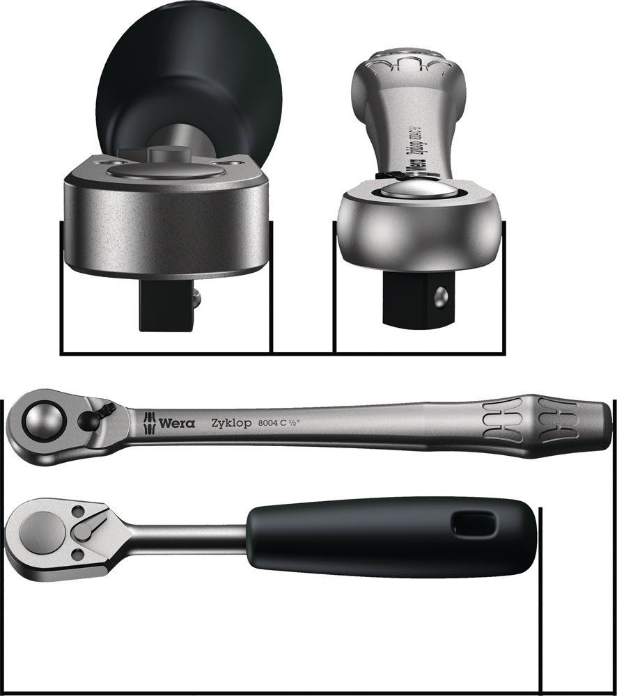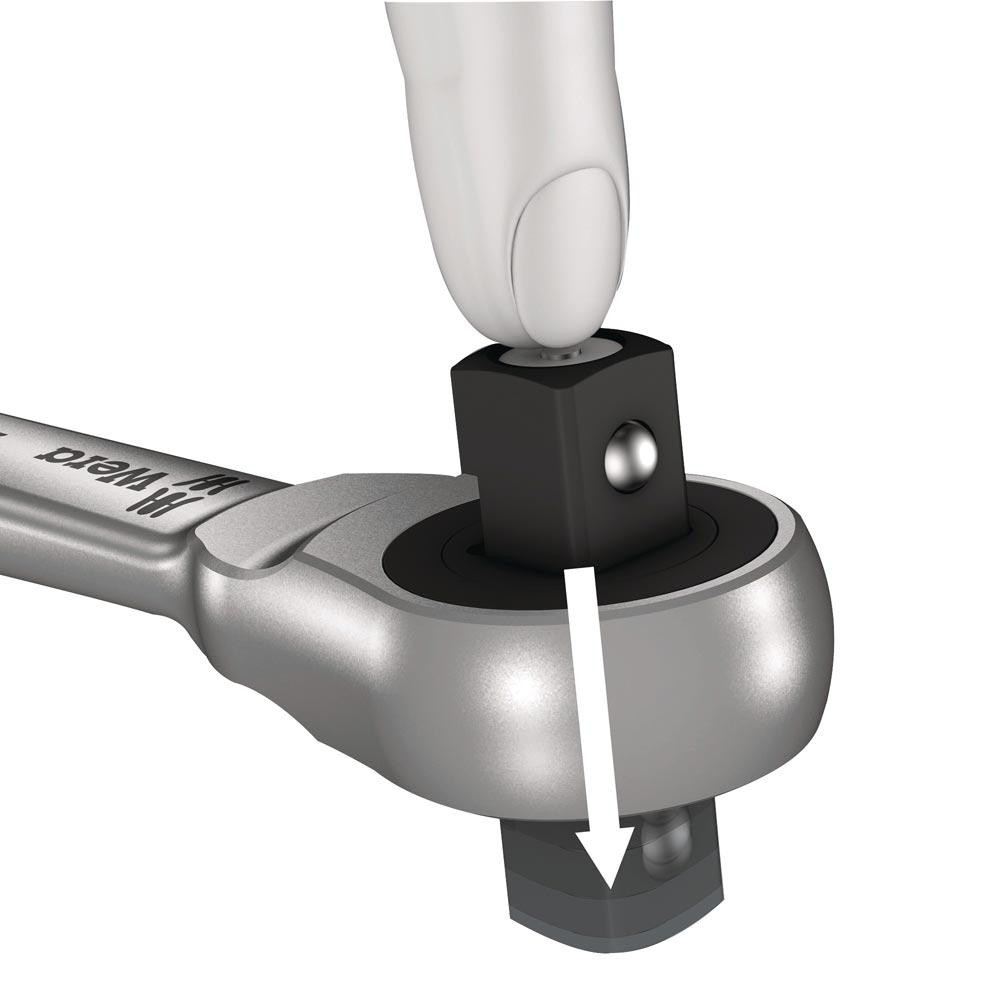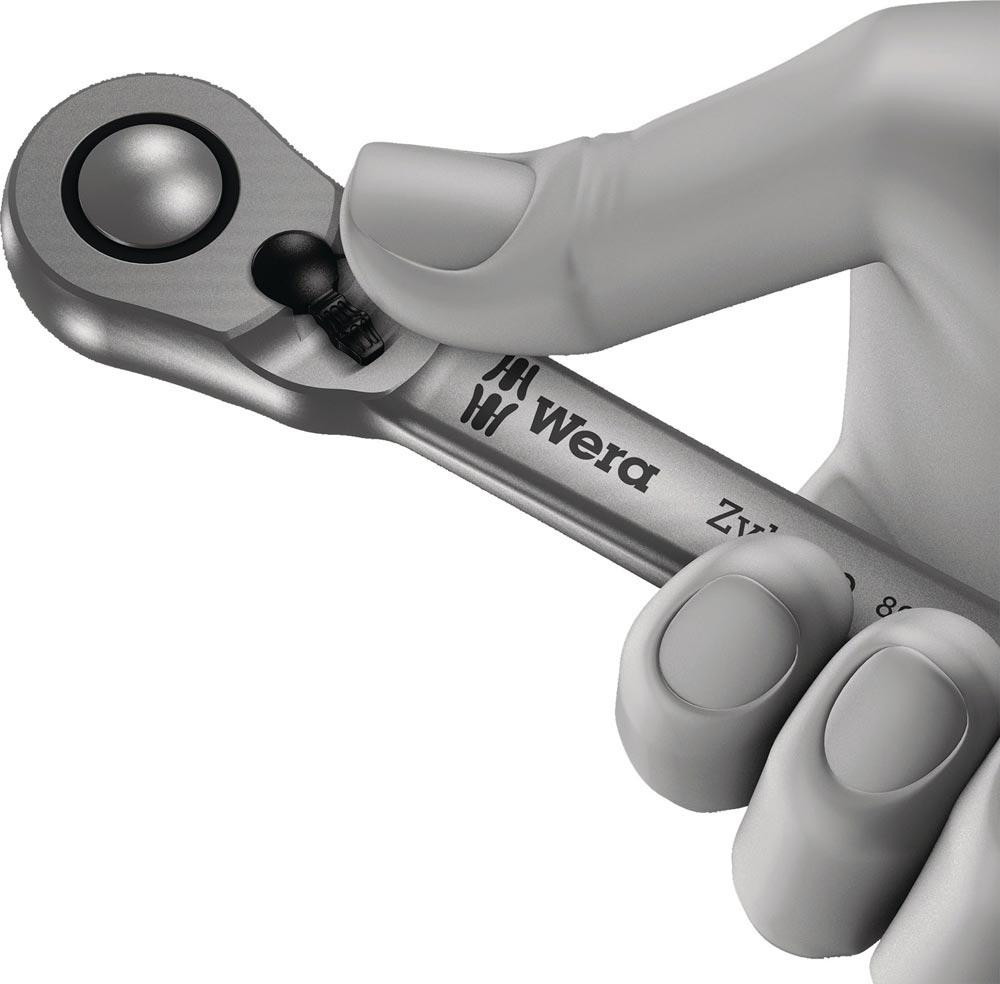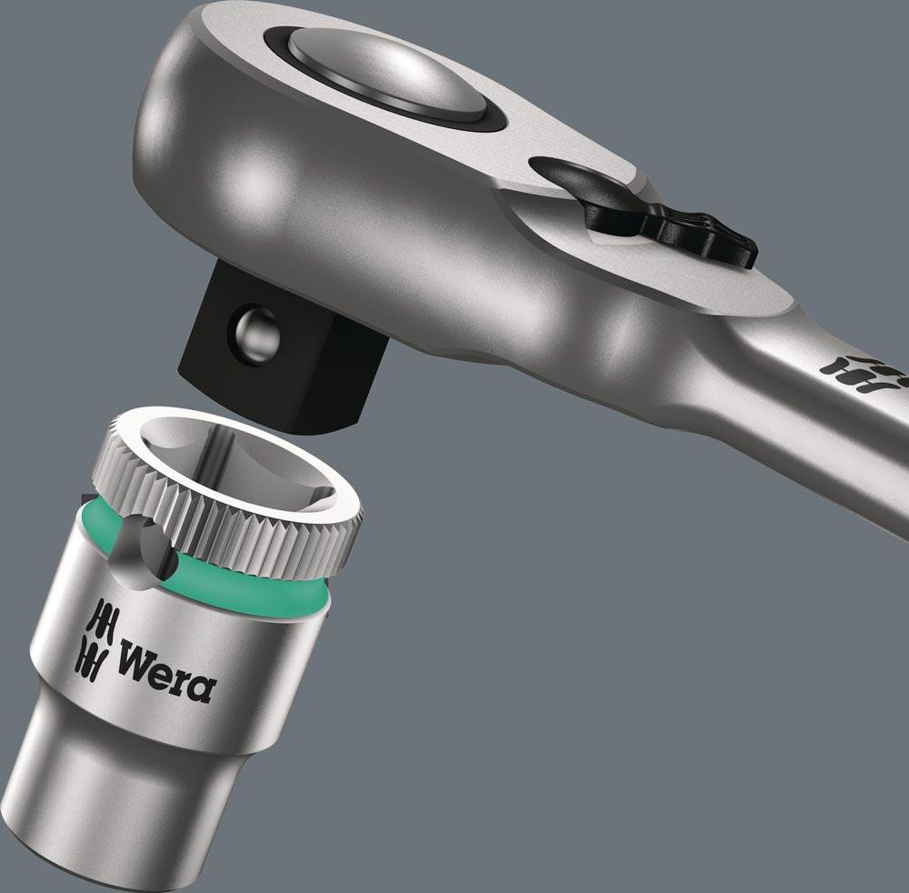 6,3 mm (1/4 ″)-Vierkantantrieb · Steckschlüssel-Einsätze und Bedienungselemente aus CV-Stahl · Knarre aus Chrom-Vanadium-Molybdän-Stahl mit Nussverriegelungsfunktion mit Druckknopfauslösung · matt verchromt