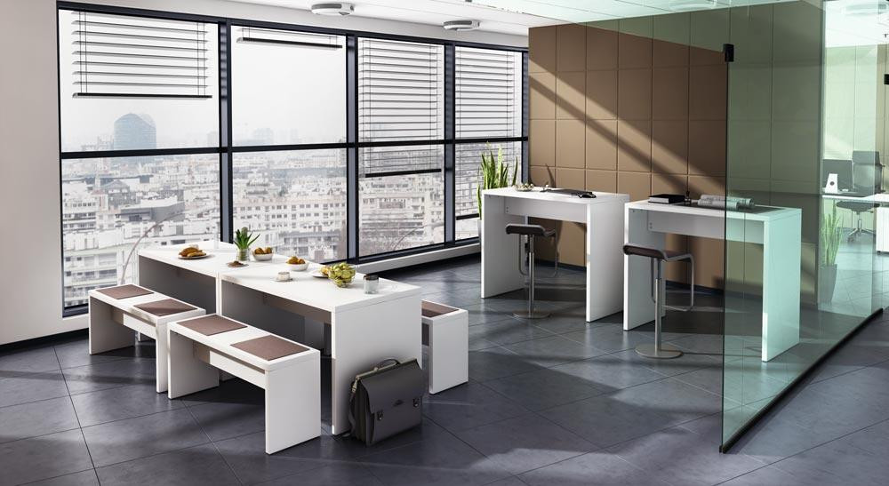 · Platte und Seiten aus melaminharzbeschichteter gewichtsreduzierter Spanplatte, 38 mm stark · Traverse aus Spanplatte, 22 mm stark · Verbindungsbeschläge in Schnellmontagetechnik · 4 Kleiderhaken unter der Tischplatte · 4 Bodengleiter