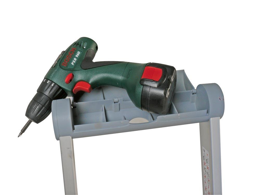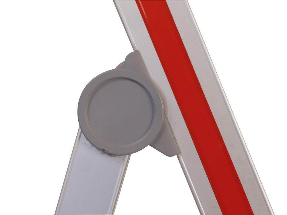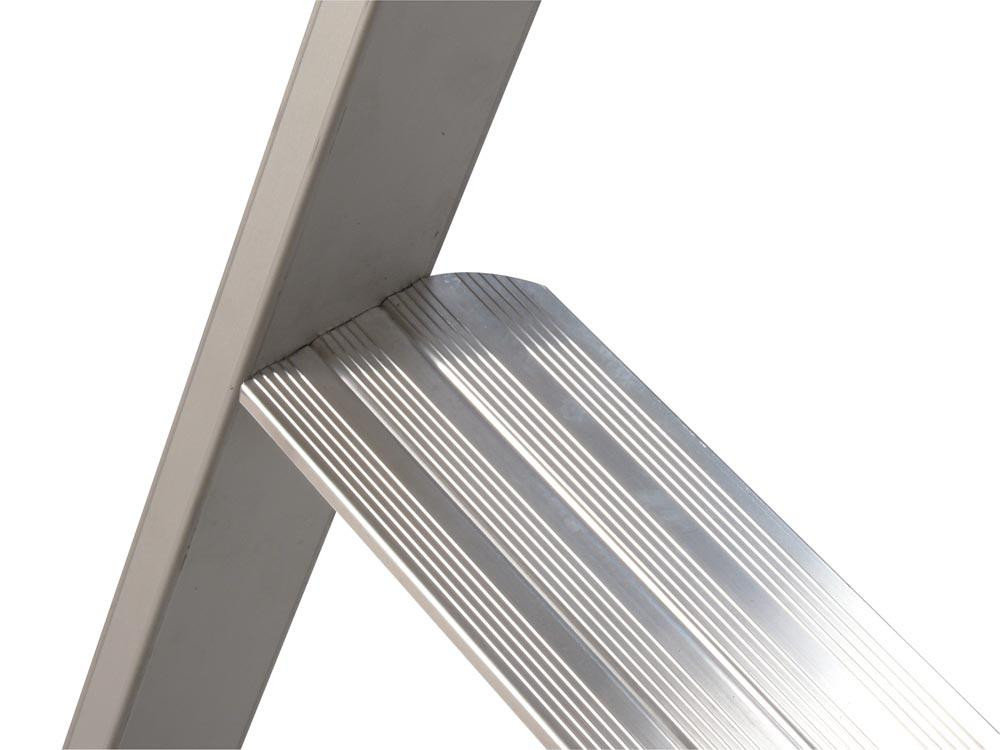 ∙ Stabile Aluminium Ausführung ∙ Einseitig begehbar ∙ Geräumige Ablageschale aus hochfestem Kunststoff mit Deckel und Eimerhaken (25 kg Traglast) ∙ Rutschhemmende Schuhe mit vergrößerter Auflagefläche ∙ Stufen vorn mit Holm bündig und hinten abgerundet, daher keine scharfen Kanten ∙ Konische Bauform ∙ Eloxierte Holme