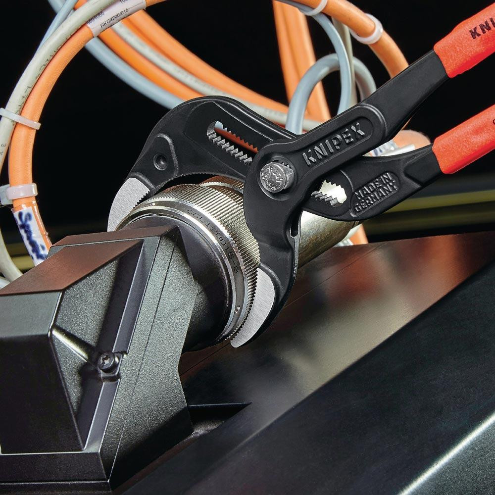 25-fach verstellbares, durchgestecktes Gelenk · Druckknopfverstellung · ergonomische Schenkelgeometrie · zum Anziehen und Lösen von Siphon-Verschraubungen, Kunststoff-Rohrverbindungen und runden Überwurfmuttern · Chrom-Vanadin-Elektrostahl, geschmiedet, ölgehärtet