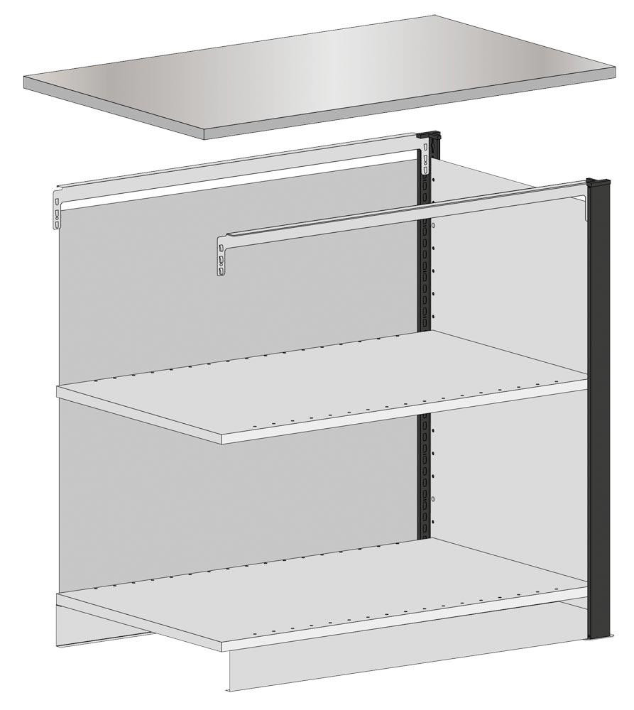 · Durch die Modulbauweise ist eine schnelle und einfache Konfiguration möglich · Jedes Modul wird standardmäßig mit 2 x 150 kg Fachböden und Sockelblende ausgeliefert · Die Fachböden sind im Raster von 25 mm in der Höhe verstellbar · Alle Module sind mit oder ohne Arbeitsplatte bestellbar · Sie können die Arbeitsplatten auch individuell bauseits beschaffen, z. B. für durchgehende Arbeitsplatten, eigene Abmessungen oder andere Oberflächen · Alle Module sind mit Frontblenden in der Farbkombination schwarz/lichtgrau ausgestattet · Die Module können optional mit einem Schubladenblock oder einer Regalschublade ausgestattet werden · Bei Bedarf sind die Theken nachträglich durch weitere Module erweiterbar