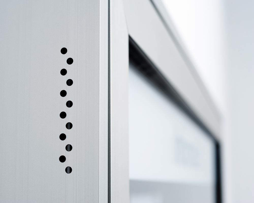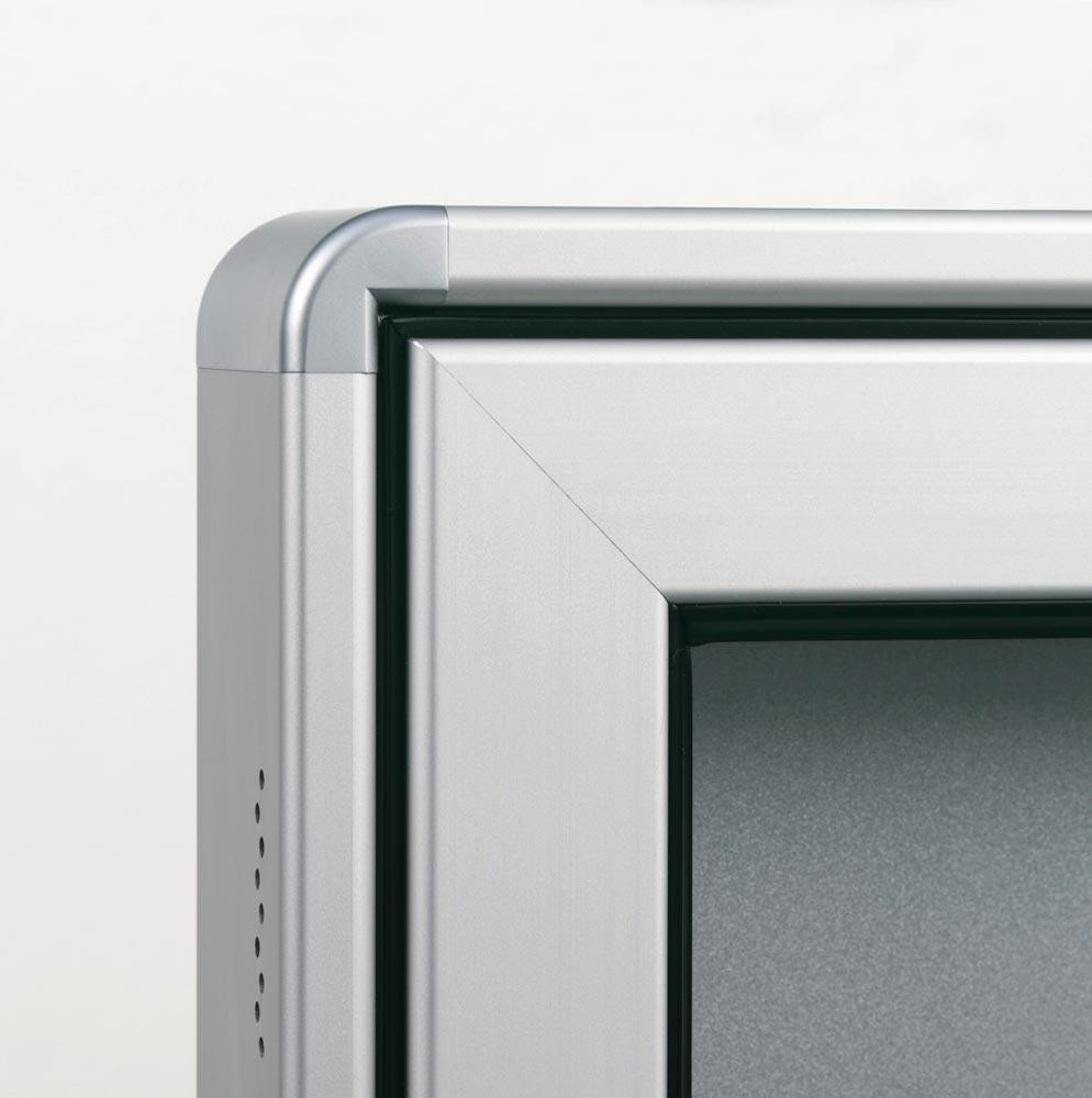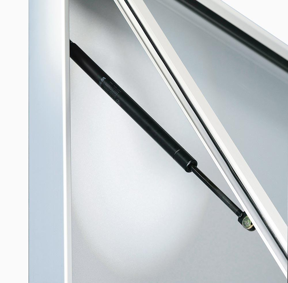 ∙ Wetterfeste Schaukästen · Sehr stabile Alu-Profilkonstruktion, silberfarbig eloxiert · Bautiefe 60 mm · Nutzbare Innentiefe 35 mm · Flügeltür aus Einscheibensicherheitsglas (ESG) ∙ Bequemes Öffnen durch Gasdruckfedern ∙ Flügel wird bei ca. 85° in Offen-Stellung sicher gehalten ∙ Sicherheitsschloss · In Hoch- und Querformat verwendbar ∙ Querformat nach oben öffnend ∙ Permanente Be- und Entlüftung · Inkl. 4 Magnete · Zur Wand- oder Ständermontage