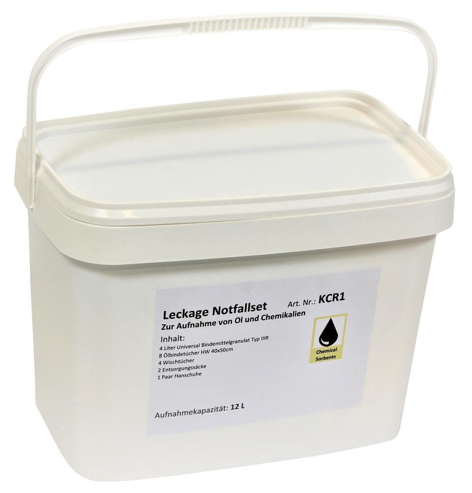 ∙ Mit Bindevlies und Bindemittelgranulat Typ IIIR ∙ Set-Inhalt: 1 Eimer mit 5 l feinem universal Bindemittelgranulat Typ IIIR, 8 einlagige Bindemitteltücher, 4 Wischtücher, 2 Entsorgungssäcke, 1 paar Handschuhe ∙ Gewicht 5,0 kg
