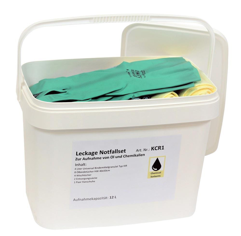 Tragbares Notfallset, Inhalt: 5 l feines Granulat Typ IIIR, 8 Chemikalientücher(gelb), 4 Wischtücher, 2 Säcke, 1 Paar Handschuhe, Auffangvol. 12 l