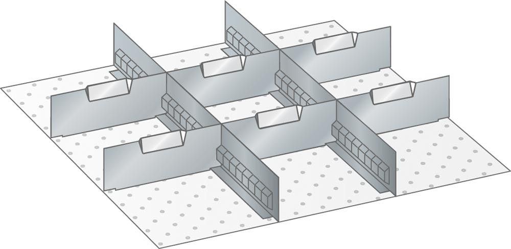 Trennwände, Fronthöhe 100 mm, 2 Schlitzwände 27E, 6 Trennbleche 9E, Schubladennutzgröße BxT 459x459 mm