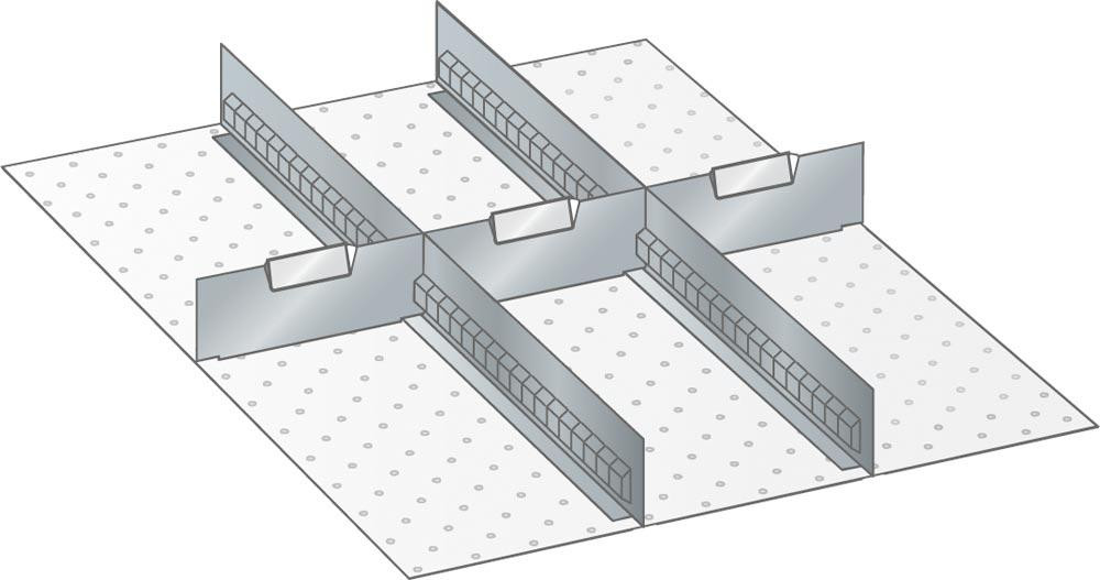 Trennwände, Fronthöhe 150 mm, 2 Schlitzwände 36E, 3 Trennbleche 9E, Schubladennutzgröße BxT 459x612 mm