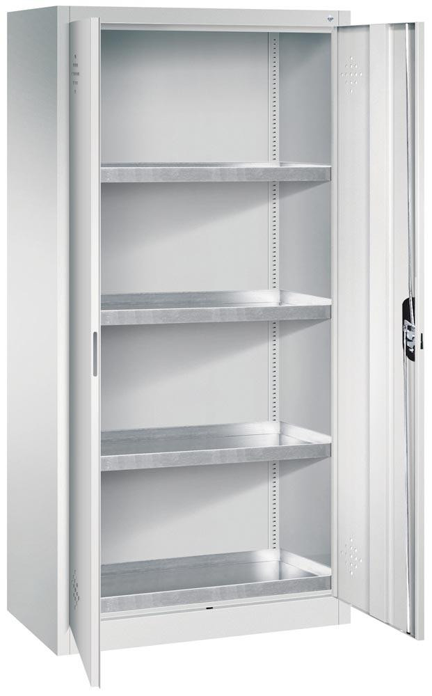 ∙ Türöffnungswinkel 110° ∙ Geprüfte Auffangwannen (gem. WHG) aus verzinktem Stahl, Traglast 80 kg, 50 mm Höhe, Auffangvolumen 10 / 20 Liter bei Breite 500 / 930 mm