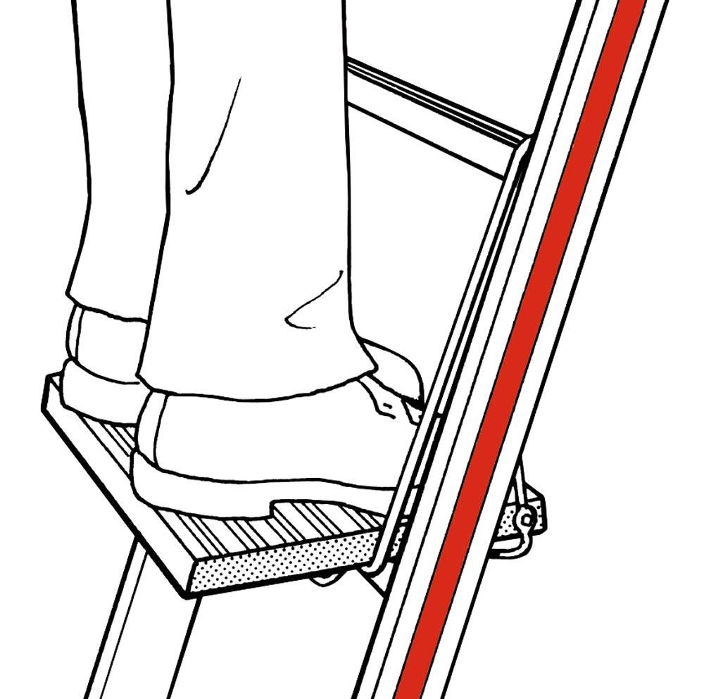 ∙ Sicherer Standplatz auf der Leiter durch mittig über der Sprosse angeordnete Trittfläche ∙ Durch den hochklappbaren Tritt ist ein sicheres Besteigen der Leiter gewährleistet