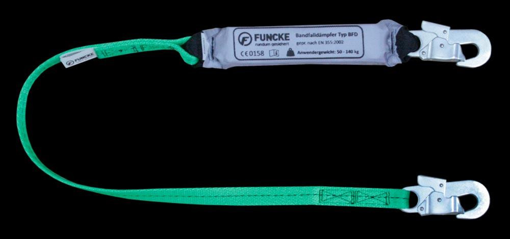 ∙ Integrierter Bandfalldämpfer ∙ Hohe Fangstoßabsorbierung ∙ Robustes Polyesterband, 27 mm breit ∙ Mit Stahl-Karabinerhaken Typ MB 51 ∙ Zugelassen nach EN 354:2010 und EN 355:2002 ∙ Kantengeprüft (horizontale Verwendung zulässig) ∙ Für Anwendergewicht 50-140 kg