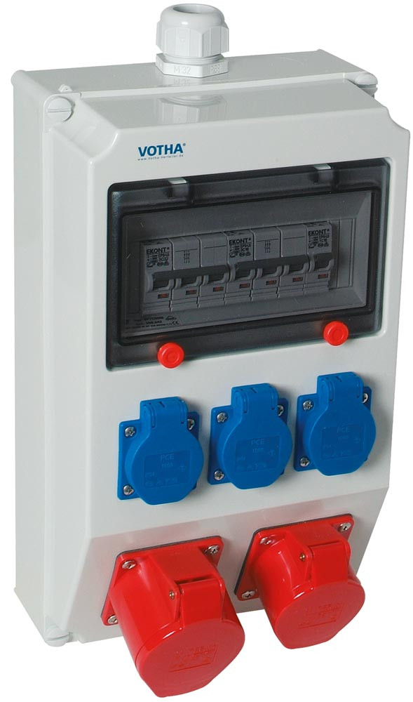 Wandstromverteiler, aus Kunststoff, Ausgang 2xCEE-Steckdosen 16 A 400 V+2 Schutzkontaktsteckdosen 230 V, 2 Sicherungen