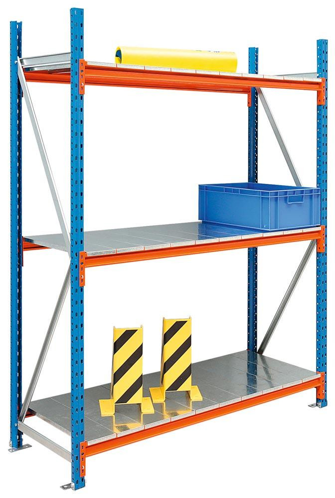 Weitspannregal, Grundfeld, 4 Ebenen mit Stahlpaneele, BxTxH 1850x1000x2500mm, Fachlast 467 kg, Z-Profil 74x30x1,5mm