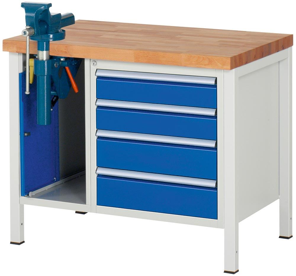 Werkbank, BxTxH 1000x700x840 mm, Platte Buche, 4 Schubl.: 2 x 120/2 x 150 mm, 1 Schraubstockschrank, Schraubstock m. Klapplift, RAL7035/5010