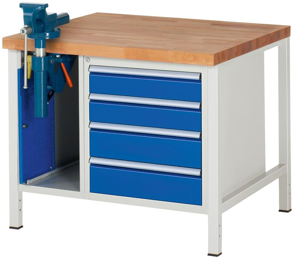 Werkbank, BxTxH 1000x900x840 mm, Platte Buche, 4 Schubl.: 2 x 120/2 x 150 mm, 1 Schraubstockschrank, Schraubstock m. Klapplift, RAL7035/5010