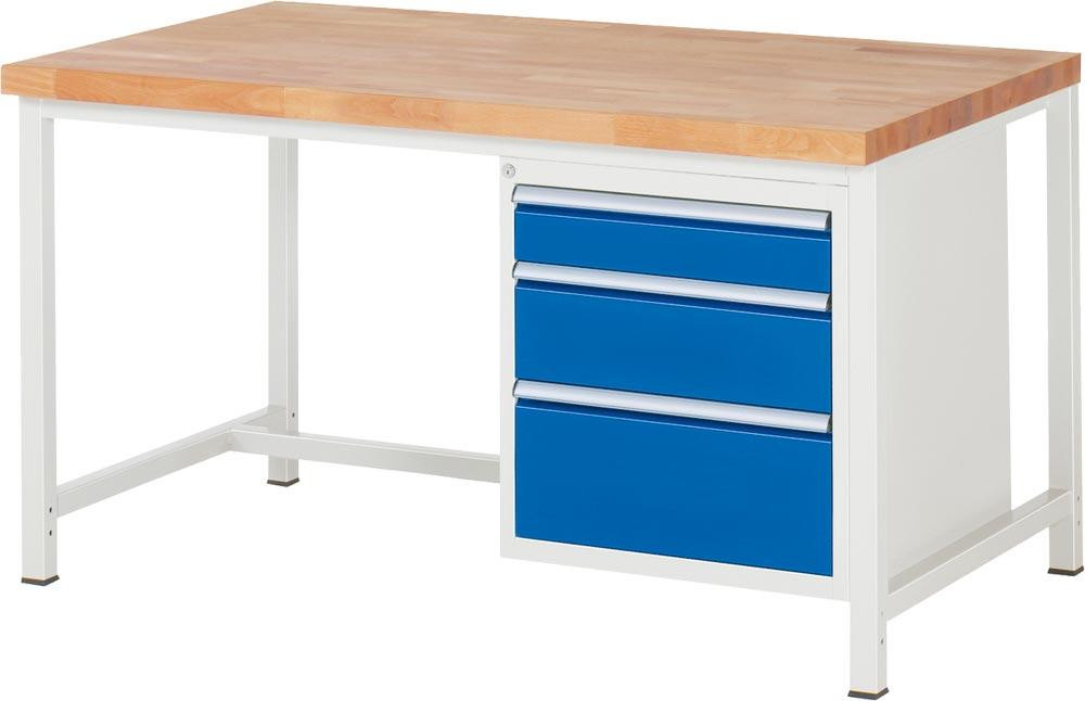 Werkbank, BxTxH 1500x900x840-1040 mm, 3 Schubladen 120/180/240 mm, Platte Buche 40 mm, RAL 7035/5010