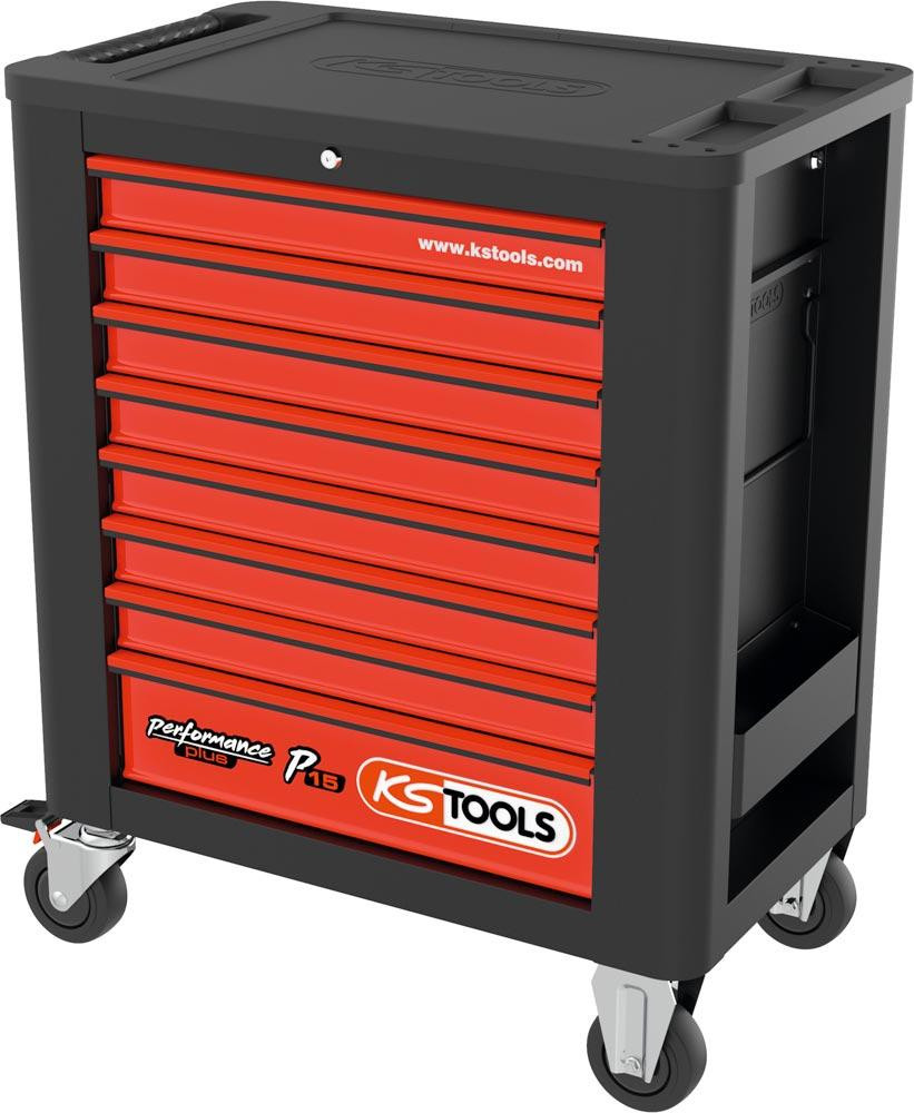 ∙ Seitenwände mit Vierkantlochung zum Anbringen verschiedener Zubehörteile ∙ Einzelverriegelung verhindert ungewolltes Öffnen ∙ Zentralverriegelung aller Schubladen durch Zylinderschloss ∙ Kugelgelagerte Schubladenführung ∙ Ecken-Kantenschutz ∙ Schubladen mit 100% Auszug ∙ Mit seitlichem Metallhandgriff ∙ Mit 2 Rädern à Ø 125 mm und