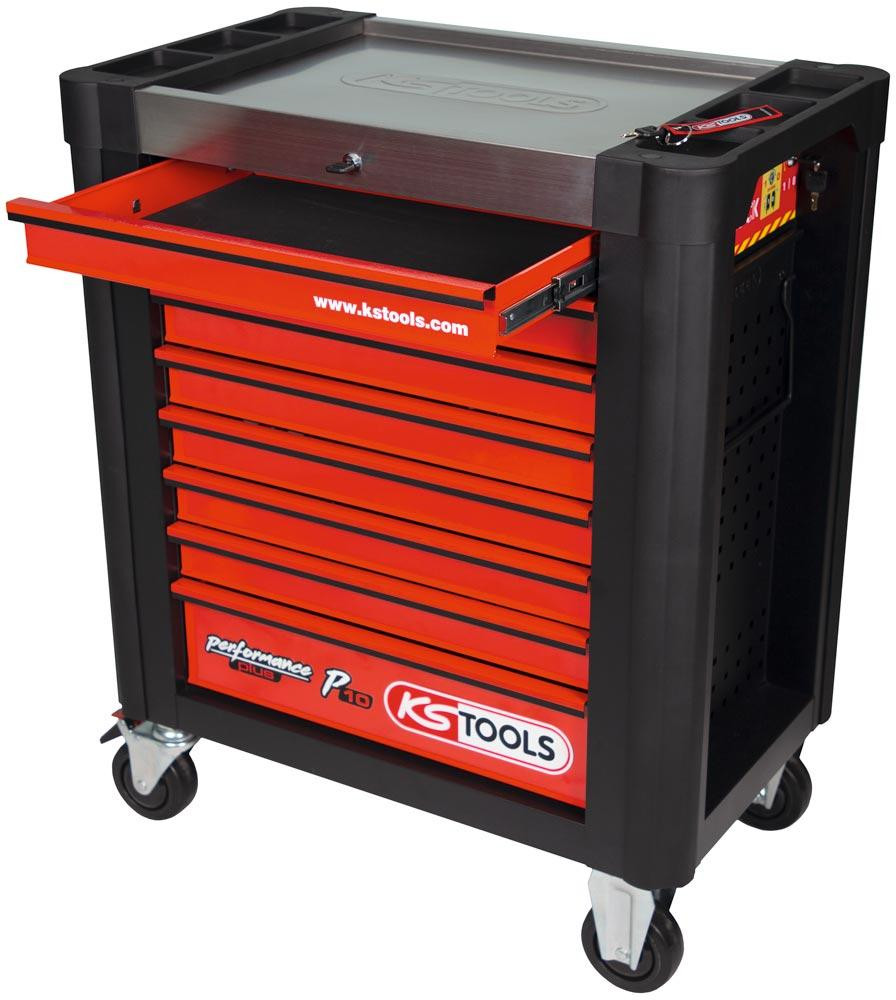 ∙ Arbeitsplatte aus Edelstahl ∙ Umrandung mit Kleinteilfächern ∙ Stabile Stahlblechkonstruktion mit 0,8 mm Blechstärke ∙ Seitenwände mit Vierkantlochung zum Anbringen verschiedener Zubehörteile ∙ Einzelverriegelung verhindert ungewolltes Öffnen · Zentralverriegelung aller Schubladen durch Zylinderschloss ∙ Kugelgelagerte Schubladenführung