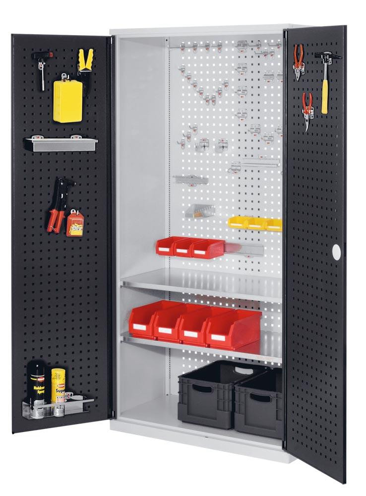 Werkzeugschrank, Türen mit Lochplatten, BxTxH 1000x500x1950 mm, 2 Fachböden, RAL 7016