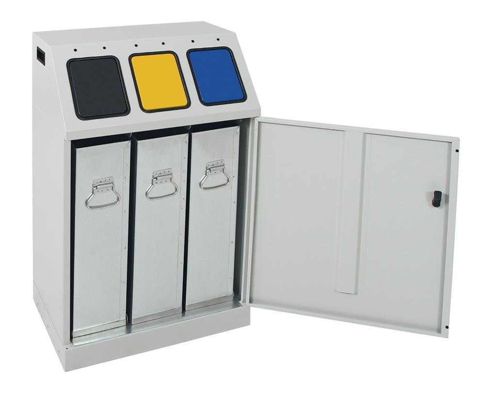 Wertstoffsammler, Volumen 3x30 Liter, BxTxH 580x380x920 mm, Korpus RAL 7035 lichtgrau, Schwingdeckel blau, anthrazit + gelb, verzinkte Innenbehälter